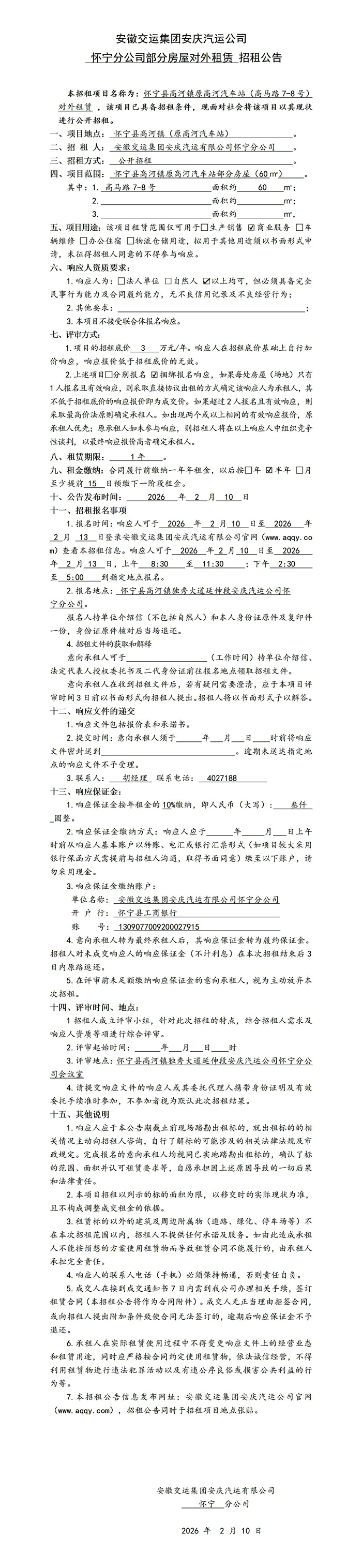 懷寧分公司部分房屋對外租賃招租公告