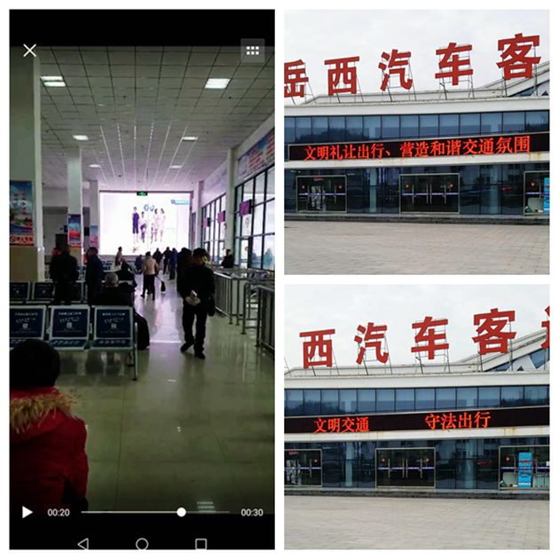 岳西分公司在交通運(yùn)輸部政府網(wǎng)站下載了《文明出行.和諧交通》、《綠色文明出行宣傳短片系列》、《文明乘車(chē).快樂(lè)出行》等公益廣告自12月24日開(kāi)始在車(chē)站候車(chē)廳電子大屏幕上滾動(dòng)播放。并利用車(chē)站對(duì)外宣傳電子屏制作了《文明交通.守法出行》、《文明禮讓出行.營(yíng)造和諧交通氛圍》等標(biāo)語(yǔ)。