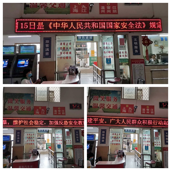 按照上級(jí)關(guān)于開(kāi)展平安建設(shè)集中宣傳活動(dòng)的文件要求,岳西分公司首先通過(guò)會(huì)議學(xué)習(xí)、張貼文件、在QQ群和微信群進(jìn)行信息推送等多種方式對(duì)平安建設(shè)工作進(jìn)行廣泛宣傳,讓文件精神傳達(dá)至每位員工和全體司售人員;其次摘取了《平安建設(shè)戶外廣告、宣傳口號(hào)》《基層與行業(yè)平安創(chuàng)建宣傳口號(hào)》《掃黑除惡專項(xiàng)斗爭(zhēng)宣傳口號(hào)》相關(guān)宣傳內(nèi)容,自5月11日以來(lái)在車站站前廣場(chǎng)電子屏上滾動(dòng)播放。