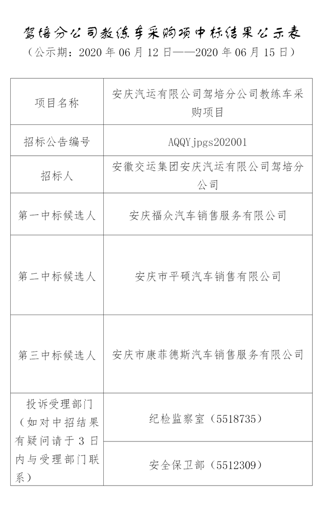 駕培分公司教練車采購(gòu)項(xiàng)中標(biāo)結(jié)果公示表