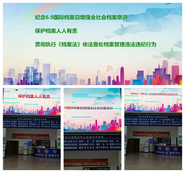 6月9日,安慶中心站通過售票大廳大屏滾動(dòng)宣傳檔案法律法規(guī),增強(qiáng)民眾檔案意識(shí),讓檔案與百姓生活真正零距離接觸。大屏主要以播放視頻宣傳片進(jìn)行宣傳,內(nèi)容緊緊圍繞著深入學(xué)習(xí)了解“國(guó)際檔案日”的相關(guān)由來,建立及發(fā)展。讓更多的職工、廣大旅客了解到檔案與你我息息相關(guān),檔案的重要性及如何利用檔案維權(quán),保護(hù)自身合法權(quán)益等。增進(jìn)群眾對(duì)檔案工作的了解,增強(qiáng)群眾檔案意識(shí),感受檔案文化與風(fēng)采,讓檔案意識(shí)融入居民的生活。