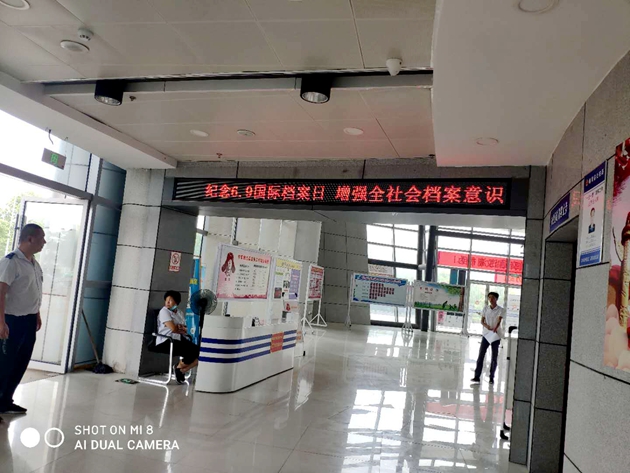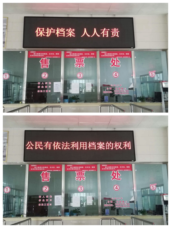 6月10日,岳西分公司在車站站前廣場(chǎng)利用電子屏對(duì)“貫徹執(zhí)行《檔案法》,依法查處檔案管理違法違紀(jì)行為”等17條國(guó)際檔案日宣傳標(biāo)語口號(hào)依次滾動(dòng)播出宣傳。此舉普及了檔案知識(shí),提高檔案事業(yè)的社會(huì)影響力,促進(jìn)檔案在服務(wù)社會(huì)方面的作用和拉近人民群眾與檔案的距離,取得了積極效果。
