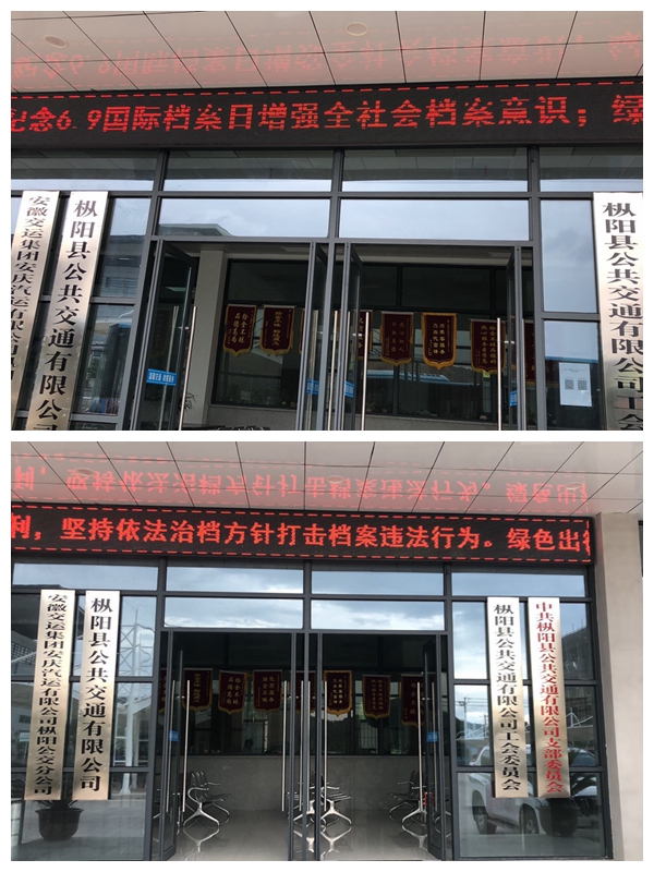 6月9日,宿松分公司在候車大廳電子顯示屏幕上不間斷播放檔案法宣傳標(biāo)語。為做好新時(shí)代檔案工作營(yíng)造良好的輿論氛圍,充分發(fā)揮其“記錄歷史,傳承文明,服務(wù)社會(huì),造福人民”的獨(dú)特作用。