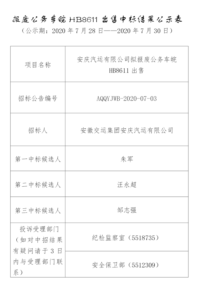 報廢公務(wù)車皖HB8611出售中標(biāo)結(jié)果公示